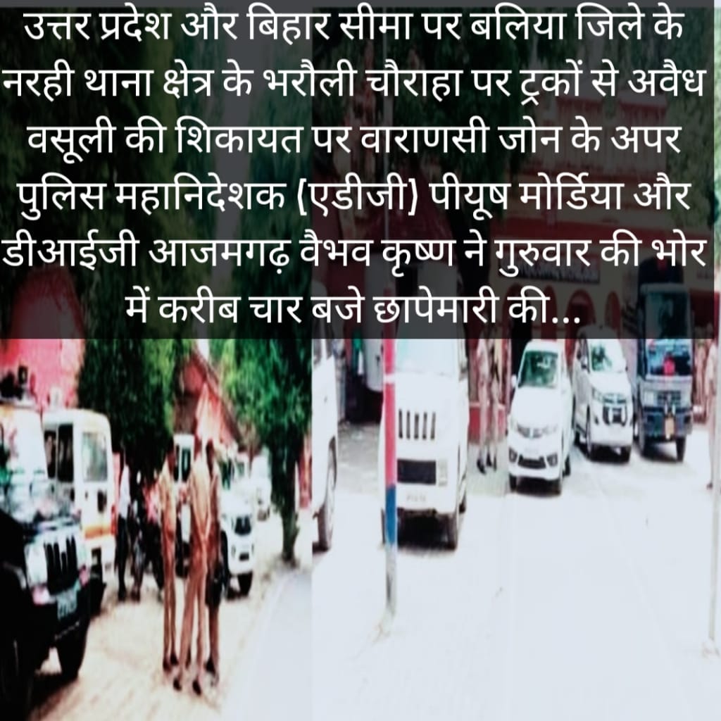 उत्तर प्रदेश और बिहार सीमा पर बलिया जिले के नरही थाना क्षेत्र के भरौली चौराहा पर ट्रकों से अवैध वसूली की शिकायत पर वाराणसी जोन के अपर पुलिस महानिदेशक (एडीजी) पीयूष मोर्डिया और डीआईजी आजमगढ़ वैभव कृष्ण ने गुरुवार की भोर में करीब चार बजे छापेमारी की। मौके से दो पुलिसकर्मी समेत करीब 18 लोगों को गिरफ्तार कर लिया गया। 50 से अधिक मोबाइल व रजिस्टर मिले हैं और इनकी 14 बाइकें भी पुलिस ने कब्जे में ली है। इसके साथ ही नरही थानाध्यक्ष का कमरा सील कर दिया गया है। पुलिसकर्मियों के बैरक खंगाले गए और उनसे पूछताछ की गई। इन सबके खिलाफ मुकदमा दर्ज कर लिया गया है। गुरुवार की सुबह बलिया से बंदियों को ले जाने वाले वाहन को बुलाकर वहां से पकड़े गए लोगों को नरही थाने पर लाया गया। इस मामले में थानाध्यक्ष समेत 23 लोगों के खिलाफ विभिन्न धाराओं के तहत मुकदमा किया गया है। अभी पांच आरोपितों की गिरफ्तारी के लिए पुलिस टीम दबिश दे रही है। एडीजी और डीआईजी की इस कार्रवाई से वसूली में लिप्त पुलिस अधिकारियों और कर्मचारियों में खलबली मच गई है।