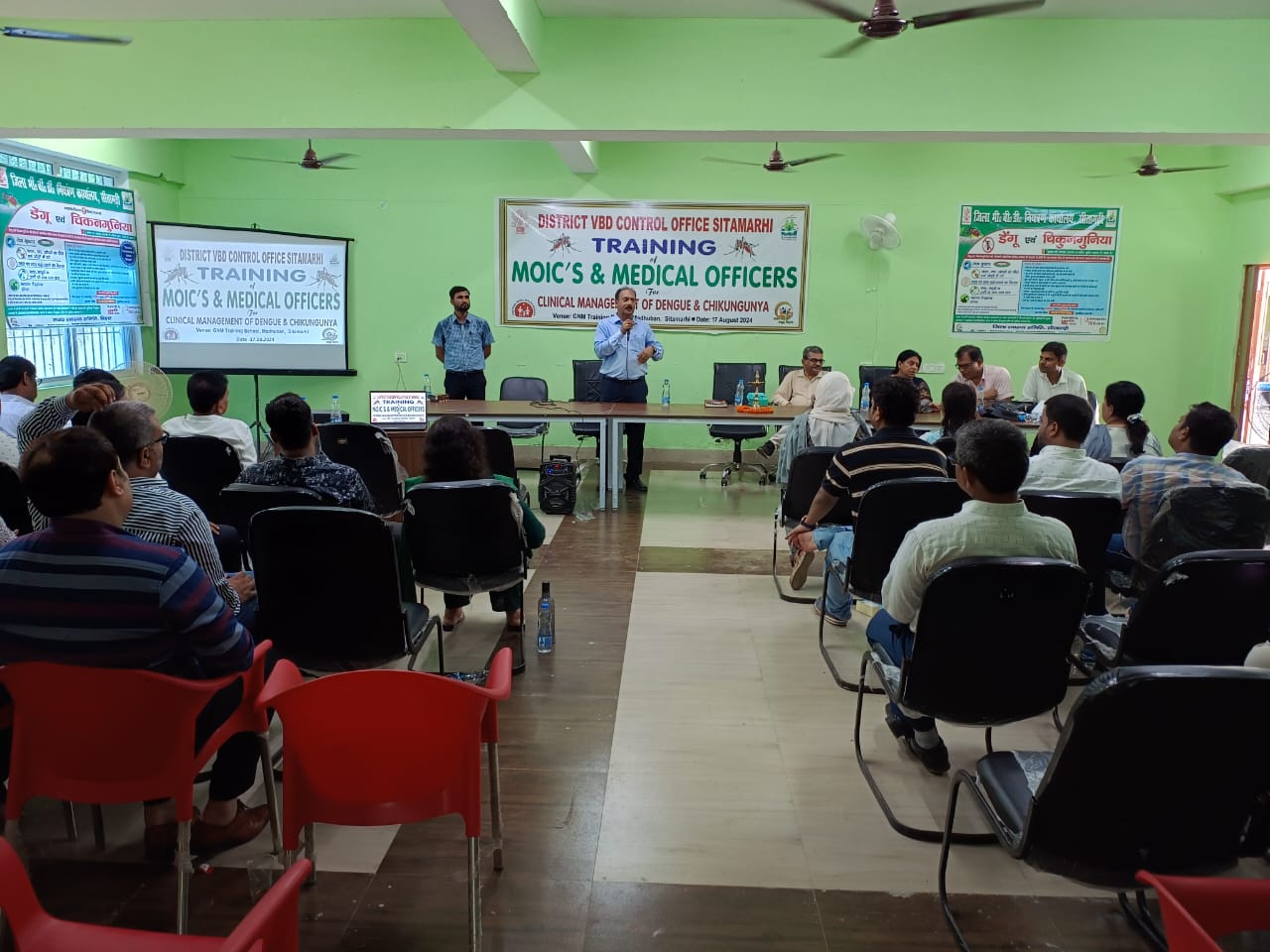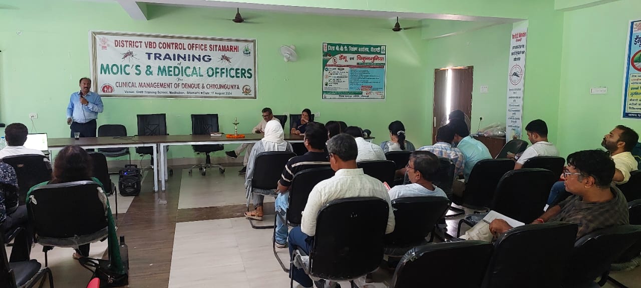 डेंगू एवं चिकनगुनिया के इलाज हेतु जिला अंतर्गत सभी चिकित्सा पदाधिकारियों का एक दिवसीय प्रशिक्षण स्थानीय जीएनएम ट्रेनिंग स्कूल में आयोजित किया गया। जिसमें जिला भीबीडी नियंत्रण पदाधिकारी डॉ रवीन्द्र कुमार यादव तथा सदर अस्पताल के डॉ राजीव कुमार द्वारा डेंगू तथा चिकनगुनिया के क्लिनिकल मैनेजमेंट को विस्तार से बताया गया। डा यादव ने डेंगू के मरीज को प्रारंभिक अवस्था में ही चिन्हित कर समुचित इलाज के गुर बताये ताकि चिकित्सक ससमय सही उपचार प्रारंभ कर सके और जटिलताओं को रोका जा सके। सदर अस्पताल में 10 बेड तथा सभी प्रखंडों में 2 बेड का डेंगू वार्ड बनाया गया है।
