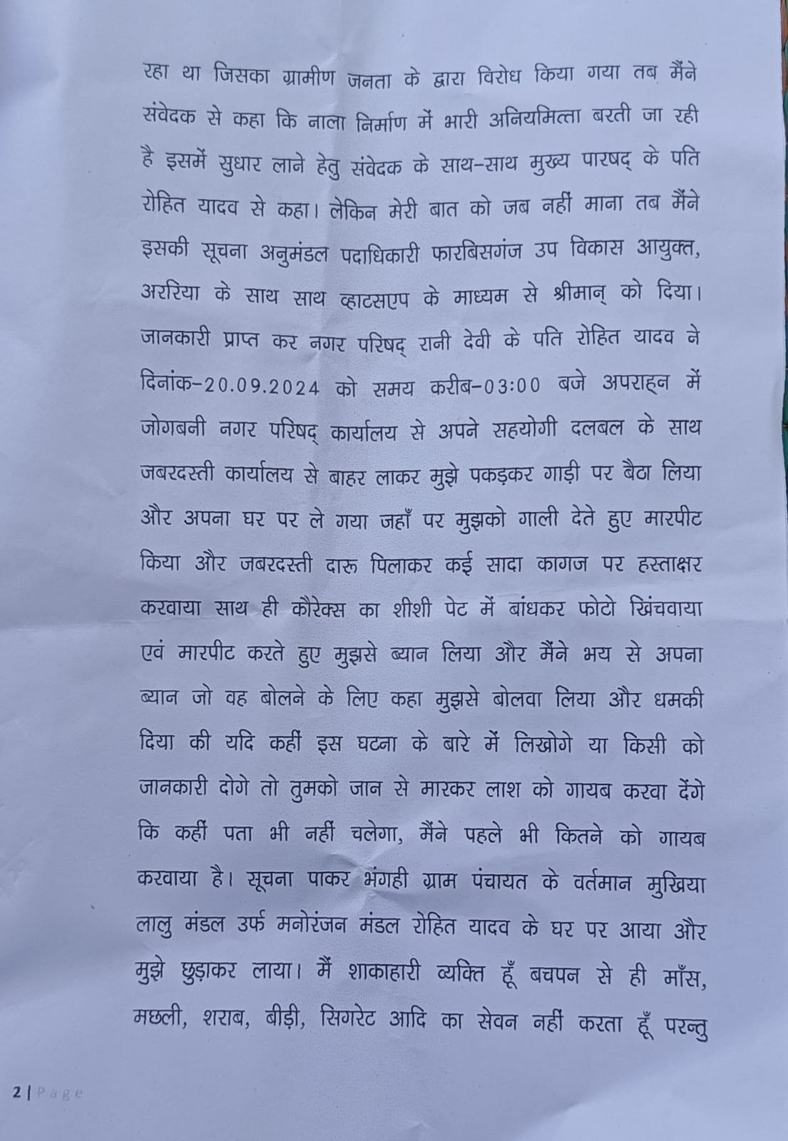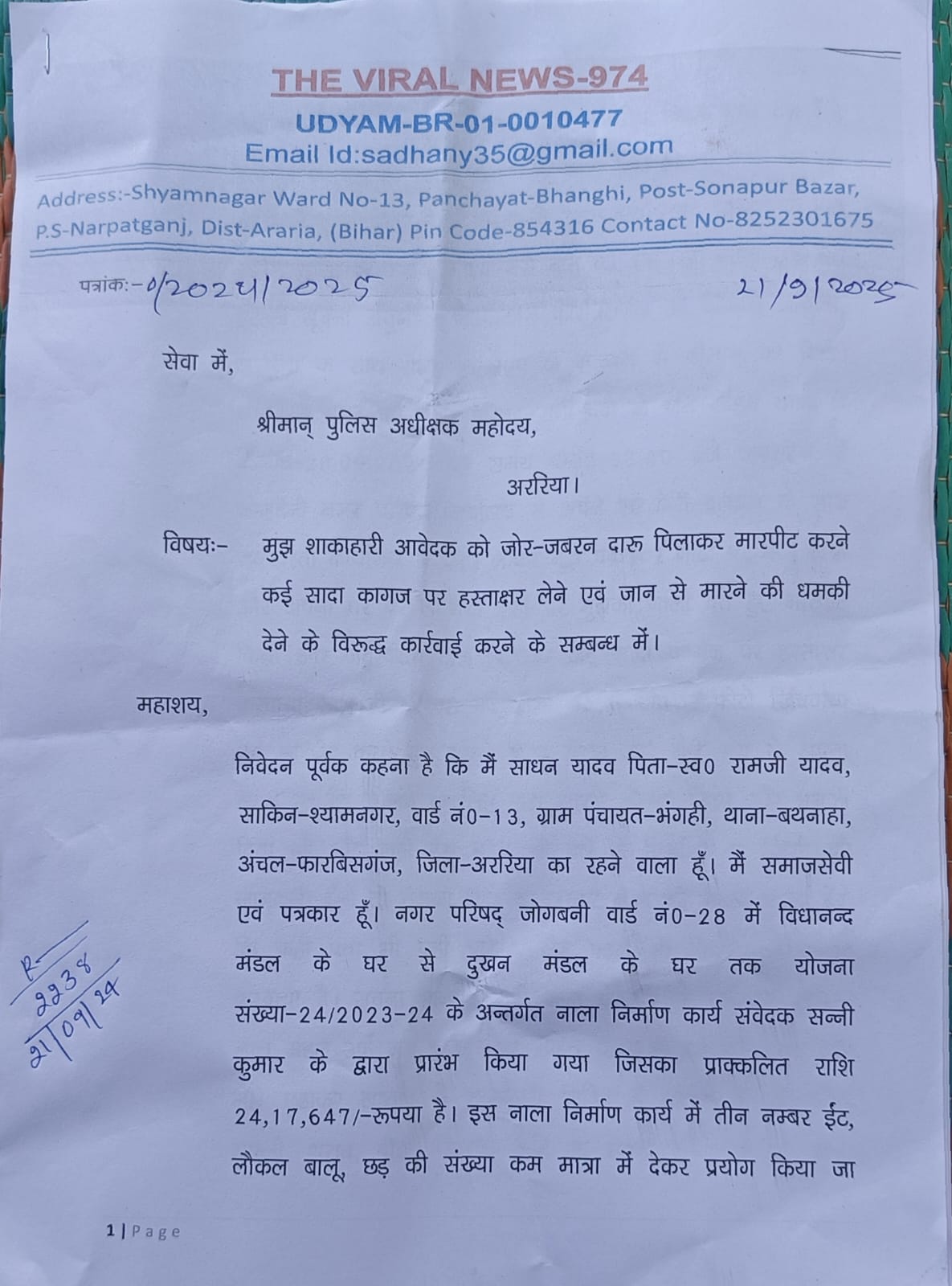 नजरिया न्यूज अररिया। अररिया, 20 सितंबर 2024: बिहार के अररिया जिले के जोगबनी नगर परिषद कार्यालय में नाला निर्माण में हो रही अनियमितताओं पर रिपोर्टिंग करने वाले एक पत्रकार पर दबंगों ने हमला किया।