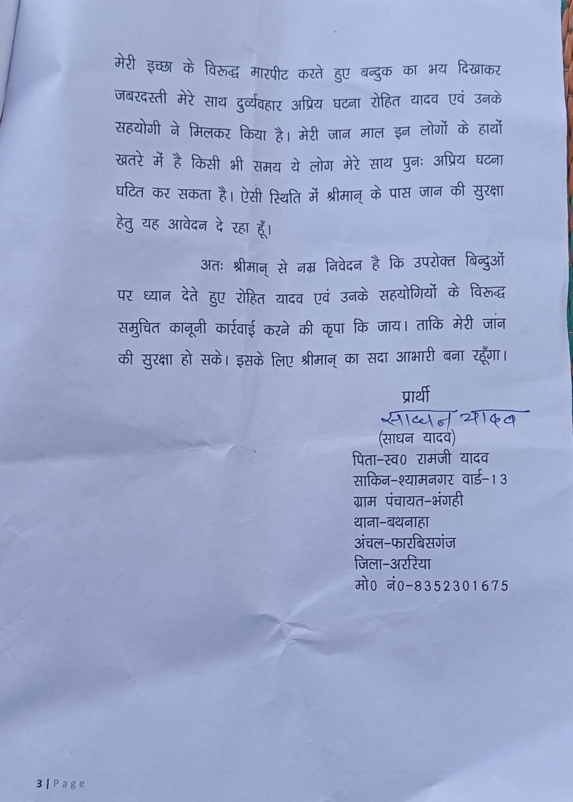 इसके बाद, उन्हें कार्यालय से बाहर निकाल कर बेरहमी से पीटा गया। हमलावरों ने न केवल शारीरिक हमला किया, बल्कि उन्हें शराब पिलाने का प्रयास भी किया, जिससे यह स्पष्ट होता है कि पत्रकारिता के प्रति उनकी नफरत कितनी गहरी है। पत्रकार ने इस मामले की लिखित शिकायत अररिया एसपी अमित रंजन को दी है, जिसमें उन्होंने सुरक्षा की गुहार लगाई है।