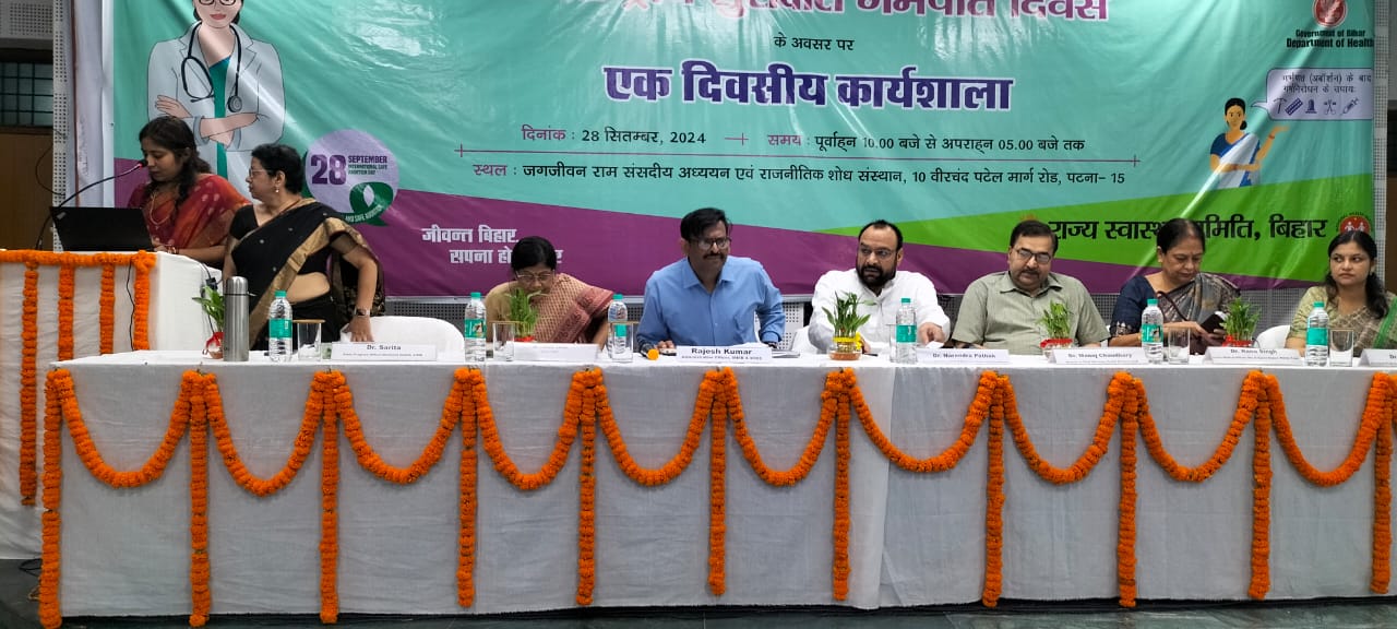 पटना- राज्य स्वास्थ्य समिति बिहार के द्वारा ‘‘अंतरराष्ट्रीय सुरक्षित गर्भपात दिवस” के अवसर पर एक दिवसीय कार्यशाला का आयोजन दिनांक 28 सितम्बर 2024 को जगजीवन राम संसदीय अध्ययन एवं राजनीतिक शोध संस्थान, पटना में किया गया। उक्त कार्यशाला में बिहार के सभी क्षेत्रीय अपर निदेशक, सिविल सर्जन, अपर मुख्य चिकित्सा पदाधिकारी, क्षेत्रीय कार्यक्रम प्रबंधक, मेडिकल कॉलेज के विभागाध्यक्ष (प्रसूति एवं स्त्री रोग विशेषज्ञ विभाग) सुरक्षित गर्भपात के मास्टर ट्रेनर्स, सुरक्षित गर्भपात सेवा प्रदाता, आशा कार्यकर्ता, डेवलपमेंट पार्टनर के प्रतिनिधि, राज्य स्वास्थ्य समीति के पदाधिकारी एवं कर्मी तथा युक्ति योजना क्लिनिक के प्रतिनिधि ने भाग लिया।