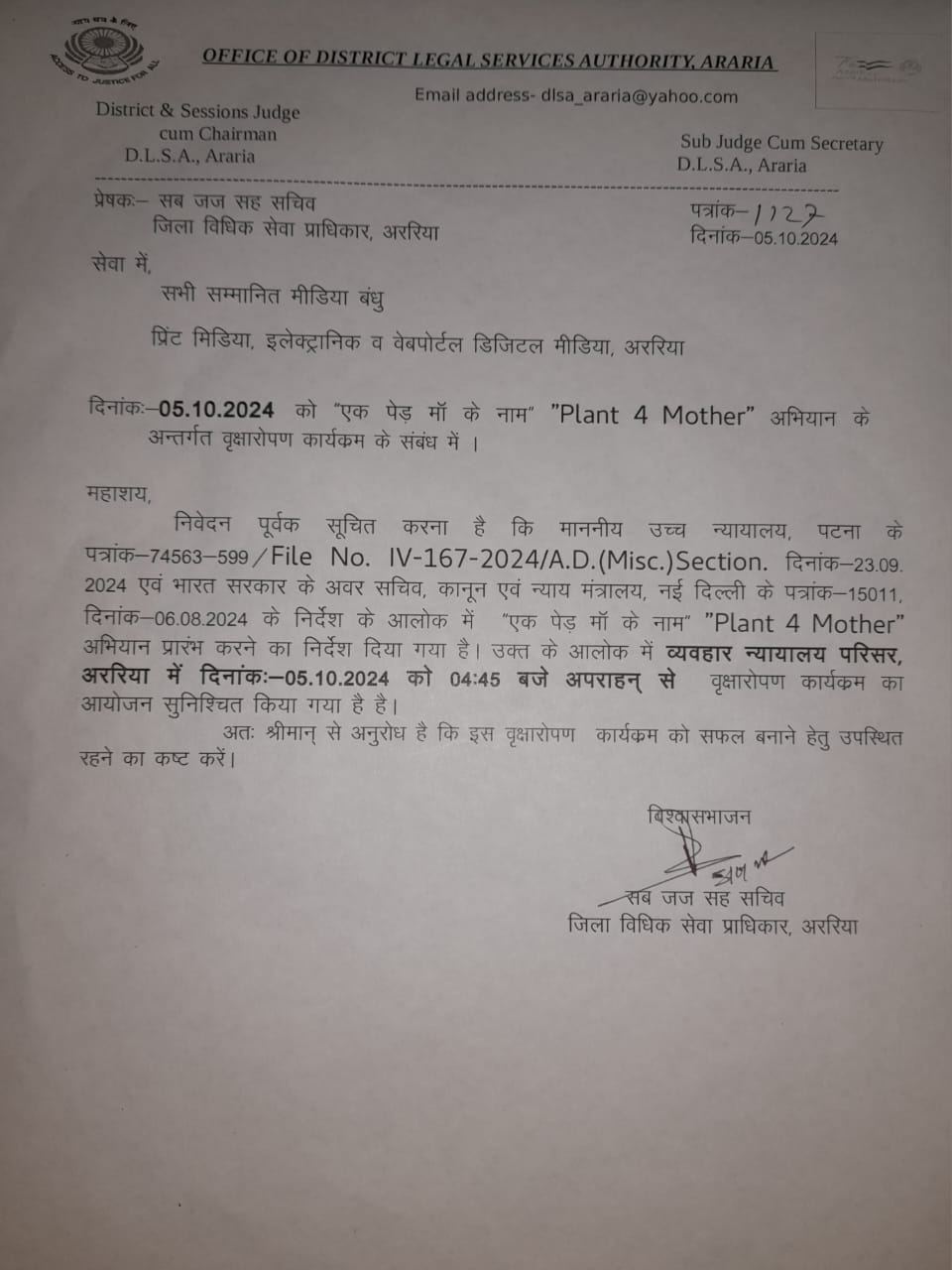आगामी 10 अक्टूबर को वर्ल्ड मेन्टल हेल्थ डे के अवसर पर मंडल कारा अररिया मे मानसिक रूप से विचाराधीन बंदी/काराधीन बंदी के लिए स्वास्थ्य जांच शिविर आयोजित करने की बात को ले न्यायमण्डल स्थित पुराने सीजेएम बिल्डिंग के प्रथम तल पर संचालित डीएलएसए कार्यालय में बैठक आयोजित किया गया।